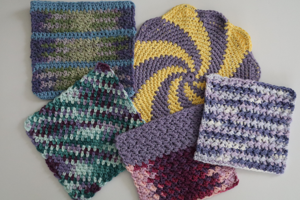 Our dishcloths are looking a bit, well, antique, so I’ve spent the last two days with my crochet hook smoking from the speed of whipping out four new ones. (The “Dahlia pan holder”, with the swirls, was actually on my Year-of-Finishing-Things list, having been sitting around for a considerable time with the ends needed to be worked in, so — check! done! I’ve written about the pattern elsewhere.) I lost my Dishcloth Gallery with TypePad’s desertion demise, but will have to figure out some kind of replacement or substitute, since I don’t think that WordPress has something like it. The purple variegated one at lower right and the purple and weirdly-pooling reds-and-pinks one (using up scraps of the cotton) are really just swatches, of even moss stitch and Suzette stitch respectively, but the other two are new-to-me patterns, Made by Gootie’s “C2C Moss Stitch” dishcloth at lower left, and Nordic Hook’s “Clara“. The latter I resized a bit, as with Lily Sugar ‘n Cream it would have come out about 9 inches wide, and I prefer smaller dishcloths. It’s still quite a handsome cloth, although again, the colors pooled strangely! The corner-to-corner one gave me a bit of trouble with the decrease half, but I think that was entirely my own fault, as watching the accompanying video after I think my fourth attempt, it narrowed down quite obediently!